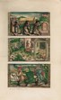 3 kolorierte Illustrationen aus einer Bibel aus dem 16. Jahrhundert. 1. Grablegung Aarons. 2. Enthauptung Goliaths. 3. Josua und Kaleb mit der Kalebstraube. Je 8x14,5 cm. Montiert auf Karton. |