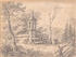 Alpenlandschaft im Österreich. Marterl mit Lothringerkreuz in alpiner Landschaft. Zwei Personen steigen den Hang hinauf zu einem Platz, der mit Tisch und Bank versehen ist. [ca. 1860]. Orig.-Bleistiftzeichnung. 15 x 19, 5 cm. Unter Passepartout. Signatur nicht lesbar (Kutte?).