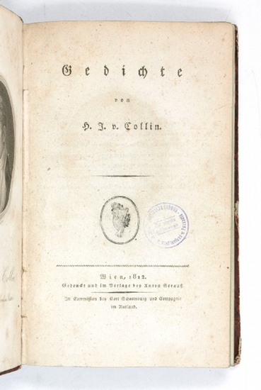 Gedichte. Wien, Anton Strauß / in Commission bey Carl Schaumburg & Co. im Ausland, 1812. (8), 288, (2) SS. Mit gest. Portraitfrontispiz in Punktiermanier. Marmorierter roter Pappband der Zeit mit goldgepr. Rückenschildchen. Dreiseitiger Farbschnitt. 8vo. Erste Ausgabe. - Ecken und Kanten berieben und bestoßen. Exemplar aus der Bibliothek des Berliner Mediziners und Literarhistorikers Leopold Hirschberg (1867-1929) mit seinem 1913 datierten Exlibris am vorderen Innendeckel. Hirschberg gab E. T. A. Hoffmanns Werke heraus. 1924 erschien sein lange gebrauchter "Taschengoedeke"; 1919 seine "Erinnerungen eines Bibliophilen". - Am hinteren Innendeckel numeriertes Buchetikett des "Ksiegarnia Antykwariat"; Titel mit Stempel einer Bibliothek aus Hirschbergs Geburtsstadt Poznan (Posen). - WG², 13. Goedeke VI, 107, 11. Wurzbach III, 412. Mayer 5078.