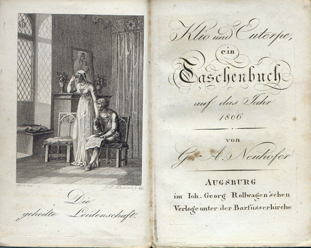 Klio und Euterpe, ein Taschenbuch auf das Jahr 1806. (herausgegeben) von G.A. Neuhofer. Augsburg, im Joh. Georgen Rollwagen'schen Verlage, (1805). 8,5x13 cm. 2 Bl., VII S., 184 S. sowie gestochenes Frontispiz und 8 gestochene Tafeln von P.J. Lamini nach Usteri. Illustrierter Originalpappband. Köhring 72. - Lanckoronska-Rümann 20. - Goedeke VIII 61,69; -Leeman-van Elck S. 204.. - Klio und Euterpe erschien unter Neuhofer von 1804 bis 1809. - Im vorliegenden Jahrgang wurde unter dem Titel "Der Dankpsalm des Unterwaldners" 8 Tafeln als Gegenstück zum "Vaterunser eines Unterwaldner" von J.M. Usteri in Zürich mit einem Text von Neuhofer, unautorisiert (?) nachgedruckt. - Die Folge war 1803 bei Mechel in Basel seitenverkeht erstmals erschienen. Usteri Protest gegen die Besatzung der Innerschweiz durch dier Napoleonischen Truppen erregte grosses Aufsehen. - Exemplar auf gutem Schreibpapier. Einband leicht berieben. Vorsatz mit längerer Notiz des Vorbesitzer über die Wichtigkeit der Ausgabe.