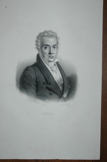 Porträt. Brustfigur. Lithographie von Monaerfeml (?). Paris, verlegt bei F.S. Delpech, ca. 1825. Blattgröße ca. 50 x 33 cm - Bildgröße ca. 23 x 20 cm. *Jacques-Louis David (geb. 30. August 1748 in Paris; gest. 29. Dezember 1825 in Brüssel) war ein bedeutender französischer Historienmaler des Klassizismus. - Großes vollrandiges Bildnis, Minimal Braunfleckchen, insgesamt sehr gut erhalten.