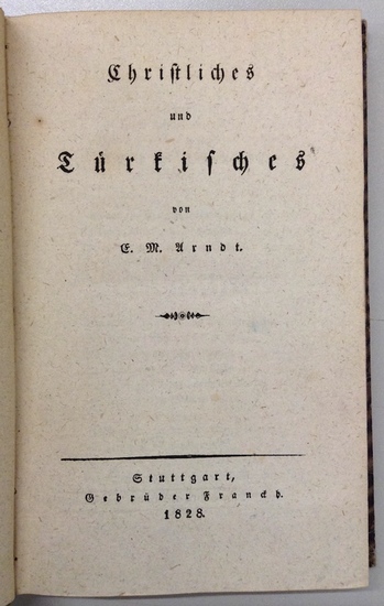 Christliches und Türkisches. Stuttgart, Franckh, 1828. S. 3-357 (so kplt.). Halbleinen d. Zeit (berieben, Ecken bestoßen, Bezug des Rückgelenks mit kurzem Einriß). Erste Ausgabe. Einleitend "Fantasien zur Berichtigung der Urtheile über künftige deutsche Verfassungen", Aufsätze, die Arndt zuerst in seinem "Wächter" von 1815/16 hatte erscheinen lassen und die "ein gewisser Herr von Mastiaux" und andere "eifrige Kämpfer für die römisch-katholische Kirche" in Frankreich als unchristlich gegeißelt hätten. Das "Türkische" steht in Arndts Überlegungen für das Heidentum, dessen "große Freiheit ... auf der scheußlichsten und grausamsten Sclaverei" beruhte. Erst das Christentum "brachte das Gesetz der Liebe und Menschlichkeit auf die Erde". - Wilpert/G. 102; Schäfer/Schawe 760. - Leicht gebräunt u. stockfleckig.