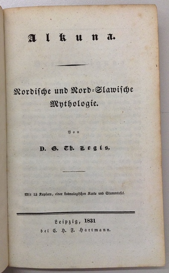 Alkuna. Nordische und Nord-Slawische Mythologie. Leipzig, Hartmann, 1831. S. III-XXVIII (so komplett); 239 S.; 58 S., 1 Bl. Mit gestochenem Frontispiz, 6 Stahlstichtafeln, 1 gefalteten Stammtafel u. 1 gefalteten Karte. Pappband d. Zeit (leicht berieben, Ecken bestoßen). Dem Werk vorangestellt ist eine "Mythologische Bildergallerie nebst Erläuterungen" in Gedichtform. Diese Vorstücke, außerdem das lange Gedicht "Skirnisfahrt" (S. 99-112) sowie der "Schlußgesang. Vom Ursprung der Dichtkunst" (S. 185-189) verfaßte der Dichter Ludwig Bechstein eigens für das vorliegende Werk. Auf den Falttafeln Götterstammbäume sowie eine kosmologische Karte. - Text gleichmäßig leicht gebräunt, Tafeln etwas stockfleckig u. vereinzelt fingerfleckig.