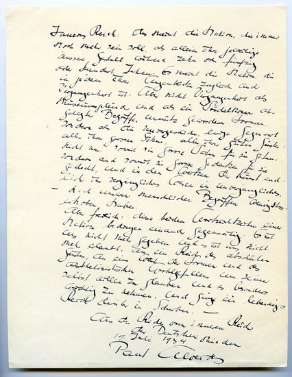 Eigenh. Albumblatt mit U. O. O. u. D. 1 S. Gr.-4to. Ein langes Zitat ?aus der Rede vom inneren Reich der Deutschen | 19. Juli 1934 München?: ?Inneres Reich: Das meint die Nation, die immer noch mehr sein soll, als allein ihre jeweilige äussere Gestalt während zehn oder fünfzig oder hundert Jahren. Es meint die Nation, die in jedem ihrer Augenblicke zugleich auch Vergangenheit ist. Aber nicht Vergangenheit als Museumsplunder und als ein Trödelkram abgelegter Begriffe, unnütz gewordener Formen, sondern als die unvergessliche ewige Gegenwart aller ihrer grossen Söhne, aller ihrer guten Geister [...]?. ? Paul Alverdes gab gemeinsam mit Karl Benno von Mechow von 1934 bis 1943 die Monatszeitschrift ?Das innere Reich? heraus: eine literarische Zeitschrift, die trotz einiger Versuche, sich einen gewissen politischen Freiraum zu wahren, insgesamt betrachtet doch die kulturpolitischen Ziele des Nationalsozialismus vertrat. Seine autobiographische Erzählung ?Die Pfeiferstube? (1929) behandelt seine Erlebnisse während eines Aufenthalts im Feldlazarett.