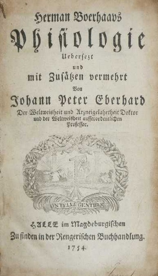 Phisiologie. (Herausgegeben von Albrecht von Haller). Uebersetzt und mit Zusätzen vermehrt von Johann Peter Eberhard. Halle, in der Rengerischen Buchhandlung., 1754. 8°. 8 n.n. Bl., 1128 S., 16 n.n. Bl. Inhalt, Register und Druckfehler. Lederband der Zeit mit schwarzem goldgeprägtem Rückenschild. Blake 54. - Steinke/Profos 383. - Erste deutsche Ausgabe dieser Zusammenstellung. - Enthält neben Boerhaaves "Insitutiones medicae" und Eberhards Zusätzen auch einige Auszüge und Zusammenfassungen von den Vorlesungsabschriften und von Hallers Anmerkungen aus Boerhaaves "Praelectiones". - Exlibris "Herbert McLean Evans Library of Medical Classics". Rücken schwach berieben. Papier durchgehend gleichmässig leicht gebräunt. 2 Blatt lose. - Gutes Exemplar. - Selten.