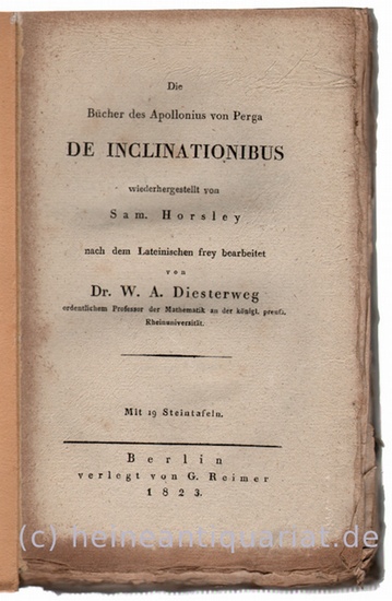 Die Bücher des Apollonius von Perga " De Inclinationibus " wiederhergestellt von Sam. Horsley nach dem Lateinischen frey bearbeitet von Dr. W. A. Diesterweg. Mit 19 Steintafeln. Berlin, verlegt von G. Reimer, 1823. (22,3 x 13,8 cm); 8°; VIII, 158 Seiten, 1 Blatt und 19 mehrfach gefaltete lithographierte Tafeln lose in der hinteren Kartentasche. Interimsbroschur. Unaufgeschnittenes Exemplar, an den Rändern teils braunfleckig. Wenige Stockflecken im Buch . Interimsbroschur ( ca. 1920 ) mit Knickspuren und Einrissen.