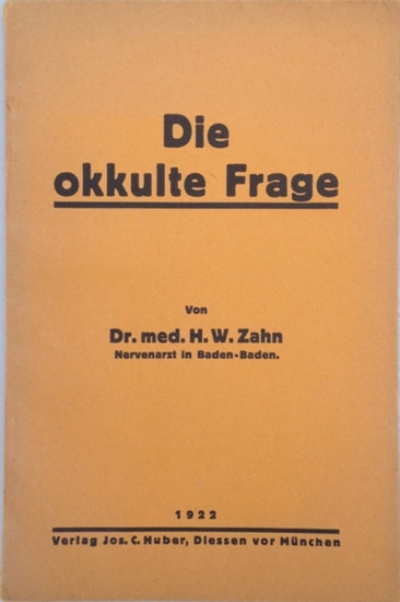 Die okkulte Frage, von Dr. med. H. W. Zahn, Nervenarzt in Baden-Baden, Diessen : J. C. Huber, 1921. 61 Seiten, 8°, gelbe OBrosch. Gutes Exemplar dieser sehr seltenen Schrift. - Enthält unter anderem Beiträge über: Betrug u. Selbsttäuschung; Das Medium; Bewegung ohne Berührung, Klopflaute; Lichterscheinungen; Psychometrische Versuche. - Hermann Wolfgang Zahn (1879-1965), deutscher Nervenarzt u. Schriftsteller. Paul Scheerbart u. A. R. Meyer zählten zu seinen Freunden; letzterer verhalf ihm als Verleger zu einigen Veröffentlichungen. Zahn befasste sich mit Hypnose u. hatte 1919-1950 ein privates Sanatorium für Nervenleiden in Baden-Baden. Er verkehrte mit Alfred Kubin, Otto Flake, Kurt Aram, Oscar A. H. Schmitz u. a. Künstlern. 1948 erschien sein Band "Die Wunderlampe", phantastische Erzählungen mit einer Deckelillustration von Alfred Kubin.