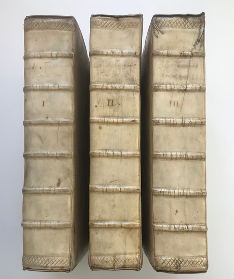Volkomene Nederlandsche concordantie ofte woord-register des Ouden Testaments (in 2 Bänden mit je einem Compleet Hebreeusch Register) und des Nieuwen Testaments (in 1 Band) (IN NIEDERLÄNDISCHER SPRACHE) 1. Bd. :" Vervattende alle de historische boecken van Genesis af tot Esther incluys", 2. Bd.:"Alle de Leer- ende Prophetische boecken van Job af tot Maleachi incluys", 3. Bd.:"...des nieuwen Testaments", 3 Bände,. Amsterdam, Gerard Borstius 1672 - 1691. mit je einer gestochenen Titel-Vignette und hübschen Schluss-Vignetten, XVI), 1142, 88, (2 Errata) Seiten, (X) 904, 132, (8 Errata), XXVIII, 1036 Seiten, 22x34, helles Pgmt mit je einem blindgeprägten handflächengroßen Medaillon auf Vorder- und Hinterdecke. schöne Exemplare, die Ecken minimal angestoßen und die Einbände mit einigen kleineren Läsuren, Band 3 mit VOLLER SIGNATUR TROMMIUS?.