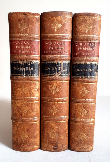 Geschichte von Amerika von dessen Entdeckung an bis auf das Ende des vorigen Krieges - 2.- 4. Bd, Bd 1 fehlt - Titelkupfer, teils farb. Falttkarten etc. - 1779 (The history of America, from its discovery by Columbus to the conclusion of the late war) Schwickertscher Verlag, Leipzig, 1779. Vollst. Titel: Geschichte von Amerika von dessen Entdeckung an bis auf das Ende des vorigen Krieges. Nebst einem Anhange, welcher eine Geschichte des Ursprunges und des Fortganges des gegenwärtigen unglücklichen Streites zwischen Groß-Britannien und seinen Colonien enthält, von William Russel Esq. (Orig.: The history of America, from its discovery by Columbus to the conclusion of the late war : With an appendix, containing an account of the rise and progress of the present unhappy contest between Great Britain and her colonies) Aus dem Englischen übersetzt. Pappeinband mit Lederrücken, 5 echte Bünde, Rückentitel und Rückendekoration goldgeprägt, roter Farbschnitt; Band 1 fehlt! Band 2: 752 S. Mit einem Titelkupfer von F. Cortez, laut Anmerkung des Herausgebers waren die zum ersten und zweiten Band bestimmten Karten bei Veröffentlichung der Bände vom Künstler nicht fertiggestellt, sollten jedoch zu einem späteren Zeitpunkt nachgeliefert werden; Band 3: 660 S. Mit einem Titelkupfer von F. Pizarro; Band 4: 480 S. Mit einem Titelkupfer von George Washington, nebst Register und 4 teils farb. Falttkarten im Anhang, hiervon 3 zu Band 1 - 3 gehörend (siehe oben): Weltkarte; Alle Bände in Fraktur; Einbände etwas berieben, etwas bestoßen, etwas angeschmutzt, Band 2 und 3 mit sehr kleiner Buchwurm-Spur am Einband, Schnitte kaum berieben, minimal angeschmutzt, Seiten leicht lichtrandig, gering angeschmutzt, kleiner Besitzerstempel auf den Rückseiten der Titelbätter, Band 4 mit sehr kleiner Buchwurm-Spur im Anhang, insgesamt altersgemäß guter Zustand. ca. 1600 gr. Shipping costs to non-EU states have significantly increased - please inquire. 8°.
