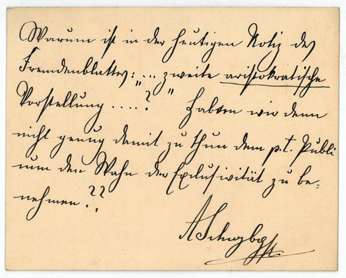 Eigenh. Notiz mit U. O. O. u. D. 1 S. auf Karte (118 x 94 mm). "Warum ist in der heutigen Notiz des Fremdenblattes: 'zweite aristokratische Vorstellung...?' Haben wir denn nicht genug damit zu thun dem p. t. Publicum den Wahn der Exclusivität zu benehmen??". - 1850 in die österreichische Armee eingetreten, machte Schwarzenberg 1850 die Schlacht bei Solferino mit; nach Friedensschluß beendete er seine militärische Laufbahn und "engagierte sich fortan in der Politik, in der er - anders als sein Vater - strikt konservative Positionen vertrat. Seit 1867 Mitglied des böhmischen Landtags, unterzeichnete Schwarzenberg als Mitglied des Herrenhauses 1879 die staatsrechtliche Verwahrung" (ÖBL XII, 12). 1888 übernahm er als achter Fürst zu Schwarzenberg die Leitung der Primogenitur.