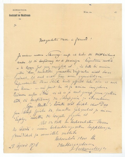 Eigenh. Brief mit U. ("J Hellmesberger"). O. O., 28. IV. 1876. 1 S. Gr.-4to. An einen namentlich nicht genannten Adressaten: "Zu meinem wahren Schmerze muß ich leider die Mittheilung machen, daß die Ausführung des so schwierigen 'Perpetuum mobile' in der kurzen Zeit ganz unmöglich ist! - Ich hatte bei meinem gestern [...] gemachten Versprechen nicht daran gedacht, daß auch nicht Einer meiner gegenwärtigen Conservatoristen dieses Stück bereits gespielt habe oder es auch nur kenne - und somit bin ich zu meinem innigsten Bedauern außer Stand [...] die Ausführung der Schlußpièce zu übernehmen [...]". - Auf Briefpapier mit gedr. Briefkopf der Gesellschaft der Musikfreunde.