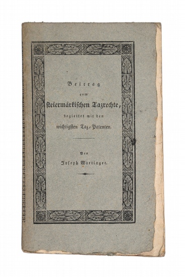 Beitrag zum steiermärkischen Taxrechte, begleitet mit den wichtigsten Tax-Patenten. Für Taxbeamte, Wein- und Bierwirthe. Graz, Damian und Sorge, 1828. Kl.-8°. 47 S., OKart. Erstausgabe. - Titel m. Namensstempel. Ecken etw. bestoßen. Etw. gebräunt u. stockfleckig.
