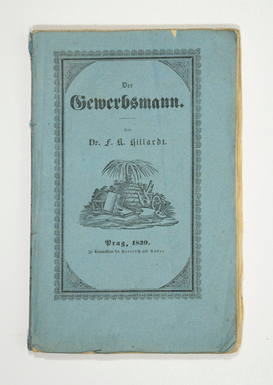 Der Gewerbsmann. Technologischer Voruntericht für Alle, welche den Werth und die Vorzüge der Gewerbstände richtig zu schätzen, die Arten der Urproducenten, Manufakturisten und Handelsleute nach ihren Leistungen zu kennen wünschen, und durch die Wahl eines Gewerbes glückliche und brauchbare Menschen werden wollen. Im Auftrage der Hohen Stände Böhmens verfaßt und mit einer tabellarischen Uibersicht der Gewerbe versehen. Prag, In Commission bei Borrosch und André, 1839. 8°. Mit einer mehrf. gefalt. Tabelle. XVI, 175 (1) S., OBrosch. Erstausgabe. - Verfasser (geb. 1804 in Böhmen), deutscher Pädagoge, studierte in Prag Philosophie und Rechte. Er bekleidete eine Erzieherstelle bei verschiedenen Adelsfamilien in Böhmen. In Jahren 1832-35 Prof. am Prager Konservatorium. Er hat die stigmographische Methode erfunden, d. i. das Schreiben und Zeichnen nach Punkten. - Umschlag m. kl. Einrissen. Etw. gebräunt bzw. stockfleckig.