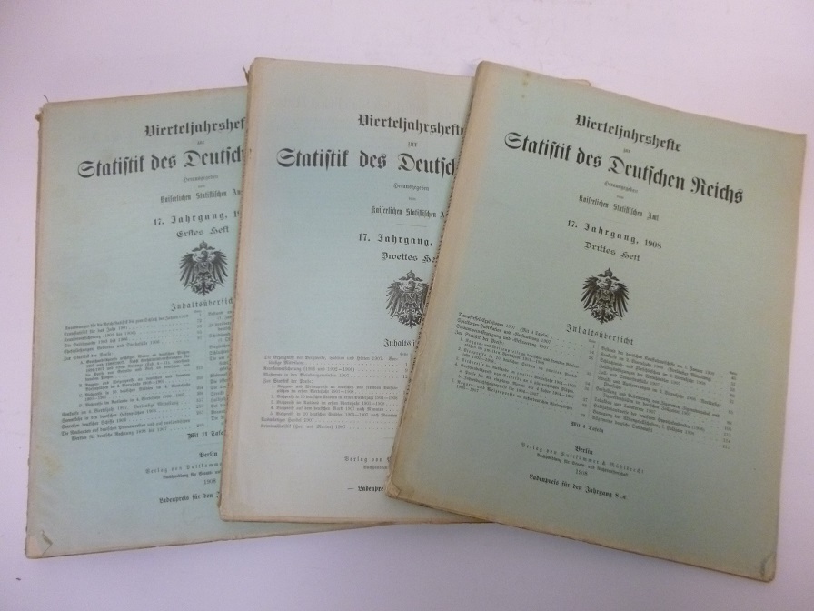 Vierteljahreshefte zur Statistik des Deutschen Reichs 17. Jahrgang / 3 Bände Verlag Puttkammer & Mühlbrecht, 1908. Bd 1. 437 S., Bd 2. 250 S., Bd 3. 116 S., Softcover/Paperback. Bücher im altersbedingt guten Zustand, unbeschnittener Buchschnitt,.