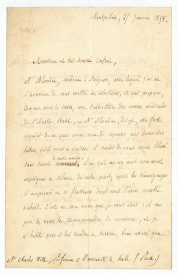 Eigenh. Brief mit U. Montpellier, 29. I. 1858. 2 SS. auf Doppelblatt. 8vo. In französischer Sprache an den Juristen Karl Witte, einen der wichtigsten Dante-Forscher und Dante-Übersetzer des 19. Jahrhunderts. - Mit gepr. Initialen.