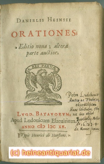 DANIELIS HEINSII ORATIONES; Editio noua; altera parte auctior. [Druckermarke, Typ Rahir M. 2.]. LVGD.[UNUM] BATAVORVM (Leiden), Apud Ludouicum Elzeuirium (Bei Ludwig Elzevir). Anno MDCXV (1615). Typis [Gedruckt von] Henrici ab Haestens. ["Orationes; Lvgd. Batavorum," und "Anno MDCXV." in Rot.]