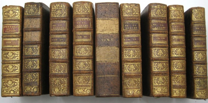 Le spectacle de la nature, ou entretiens sur les particularités de l'histoire naturelle, Qui ont paru les plus propres à rendre les Jeunes-Gens curieux, & à leur former l'esprit. Mischauflage. 8 Bde. in 9 (=Alles). Paris, Estienne 1751-68. Kl.8°. Mit 7 (von 9) Frontisp. u. 203 (163 gef.) Kupfern. Marmor. Lederband der Zeit mit Rückenvergoldung, Stehkantenvergoldung und Buntpapiervorsätzen. Barbier IV, 557/558. Vgl. Wegehaupt I/1696 und Brüggemann II/718 (beide über die dt. Ausgabe). - Enzyklopädie für die Jugend mit Abschnitten über Flora, Fauna, Schiffsbau, Handwerk, Künste, Weben, Mühlen, Geographie, Textilverarbeitung etc. "Der Verfasser Noël Antoine Pluche (1688-1761) war Abbé und galt als gelehrter Literat.. Das Buch ist in 14 "Unterredungen" eingeteilt, die jedoch keine Dialoge, sondern reine Abhandlungen sind (Brüggemann II/718). - Teils angestoßen. Band 5 abweichend in Halbleder d. Zt. gebunden. Die Bände 5-7 in 2. Auflage. Stempel auf Titelrückseite. 4 Kupfer mit Einriß (1 hinterlegt), 1 Kupfer mit Einriß ins Bild, 2 Kupfer mit Fehlstelle. Bd. 2 mit Feuchtigkeitsspuren. Bd. 5: 1 Bogen lose.