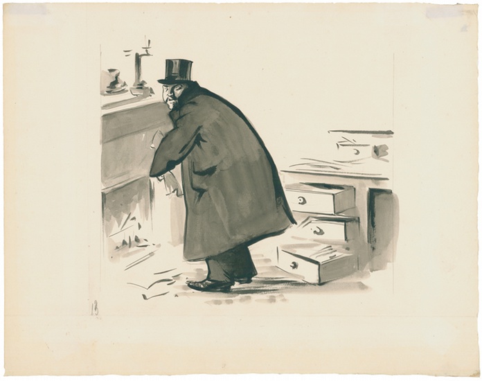 Der Geheimniskrämer. _. Tuschfeder- und Tuschpinselzeichnung. Blatt 13 einer Illustrationsfolge. 25,1:32,2 cm. Literatur: Thieme/Becker, XXVI, S. 308; Benezit, IV, S. 672; Kunsthaus Bühler, Stuttgart, 1989, Fin de siècle. Gemälde, Aquarelle, Handzeichnungen, Karikaturen und Graphik, SS. 2, 3, 33-40. Maler, Plakatkünstler, Illustrator und Karikaturist, Mitarbeiter ?Courrier Francais?, ?Le figaro?, ?Stifflet?, ?Cri de Paris? und ?Le Rire?.