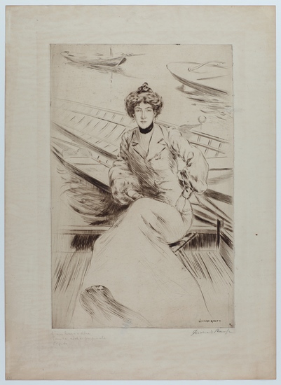 L' embarcadère. Junge Frau an einer Schiffslände. _. Kaltnadel in Braun, signiert. 43,5:28 cm. Delteil, S. 385. ? Klar zeichnender Abdruck mit zartem Plattenton auf Bütten. Mit zwei Bereibungen in der Oberfläche. Ranft war als Landschaftsmaler, Vedutenzeichner und Radierer tätig. Seine Ausbildung absolvierte er bei E. Sordet (1836-1915) und A. Dumont (1828-1894) in Genf. Anschließend zog er nach Paris.