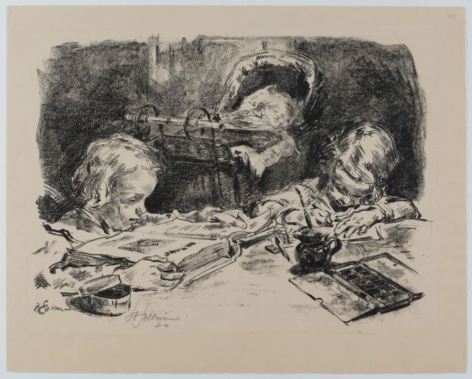 Kinderstube. Innenraumszene mit zwei jungen Kindern am Tisch beim Lesen und Zeichnen, ein drittes schläft im Kinderwagen. _. Lithographie, 1924, auf chamoisfarbenem Japan, signiert und datiert. 39,9:49,9 cm. Literatur: Söhn Bd. V, S. 49, 51012-6. Aus: XII. Jahresgabe für Freunde Graphischer Kunst 1924, Leipzig. ? Tadellos frisches Exemplar.