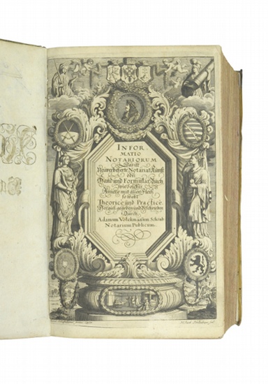 Neuverbesserte Notariat-Kunst Oder Hand- und Formularbuch, In vier Theil abgefasst, Darinnen tractiret und gehandelt wird, Im Ersten: De arte et officio notariatus, Vom Notariat-Ampt und dessen dreyen Haupt-Stücken. Im Andern: De processibus, Vom Peinlichen- und Inquisition-Proceß [...]. Im Dritten: De disputationibus testium et attestatorum, Von Disputation der Zeugen-Person ihren Aussagen und verführten Beweisungen. Im Vierten: De rebus rempublic. concernentibus, Von denen bey einer Republica und Stadt-Regiment fürlauffenden Sachen [...]. Editio novissima [...]. 4 Teile in einem Band. Frankfurt-Leipzig, Christian Scholvien für Johann Grosse u.a., 1680. Fol. Mit einem illustr. Kupfertitel u. 5 mitpag. gefalt. Tabellen. Zus. ca. 1590 S., Pgmt. d. Zt. m. durchzogenen Bünden, handschriftl. Rückentitel u. dreiseitig gespränkeltem Farbschnitt. Vierte Ausgabe. - Der Verfasser (um 1614-1664) war Notar in Dresden, später Amtsschösser in Pirna, Rechtsrat der Lehensverwaltung Brandenburg, 1661 geheimer Rat und Direktor der Lehenskammer als Nachfolger Georg von Ritterhausens. Das vorliegende, erstmals 1629 erschienene und bis ins 18. Jahrhundert hinein immer wieder aktualisierte Notariats-Handbuch behandelt Kaufverträge, Mietsachen, Testamente, Bürgschaften, Schuldverschreibungen, Vollmachten usw., jeweils mit Musterbriefen bzw. Formularen. Vorliegend die letzte Ausgabe vor der Neubearbeitung von G. Beyer. - Einband etw. berieben, bestoßen u. fleckig. Vortitel m. alt gestrichenem Besitzvermerk. Titel m. kl. altem Besitzvermerk. Wenige kl., tlw. ausgebesserte Läsuren. Tlw. schwach gebräunt bzw. stockfleckig. - VD17, 3:310857W; Lipenius II, 82.