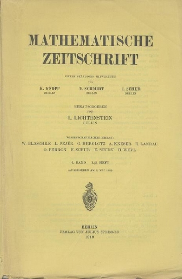 Mathematische Zeitschrift. Unter st�ndiger Mitwirkung von Konrad Knopp, Erhart Schmidt u. Issai Schur hrsg. v. Leon Lichtenstein. 4. Band. 4 in 2 Heften. Springer, Berlin 1919. Zus. 319 Seiten. Brosch. Geringe Gebrsp. Unaufgeschnitten. - Beitr�ge: L. Bieberbach, H. Cramer, H. Hahn, H. Hamburger, F. Hausdorff, E. Landau, H. Liebmann, R. v. Mises, A. Ostrowski (2), O. Perron, H. Rademacher (2), I. Schur, O. Szasz und G. Szegö. Aus der Bibliothek des Freiburger Mathematikers Bernhard Merten, Studienkollege und lebenslanger Freund des Philosophen Rudolf Carnap.