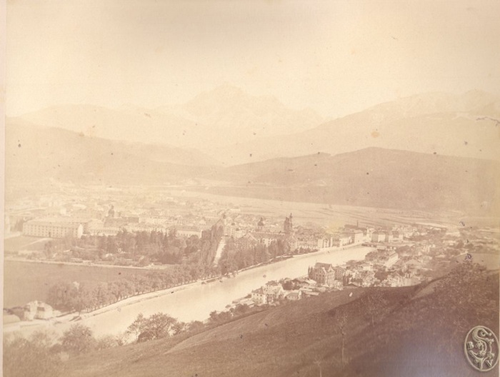 2 Orig.-Photographien (Salzpapier). Innsbruck, C. A. Czichna [ca. 1880]. Auf bedruckte Orig.-Kartons aufgezogen. Starl 81 - 1. Innsbruck gegen Süden. . 31, 8 x 41, 2 cm. (Blattgr.); 20, 5 x 25 cm. (Bildgr.). 2. Schloß Amras bei Innsbruck. 31, 8 x 41, 2 cm. (Blattgr.); 20, 5 x 25 cm. (Bildgr.).