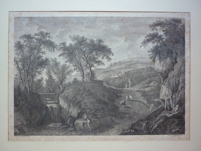 Landschaft mit Hirten vor Bergdorf. Kupferstich. Um 1800. Bildgrösse 24x34 cm. Unter Passepartout auf Unterlage montiert. Das Passepartout gestempelt: Landammann Dietrich Schindler. Etwas stockfleckig. Landschaft mit Bach, Hirten, im Hintergrund Bergdorf, 2 Schafe und Geissbock. Nach einem Bild von Salomon Gessner, gestochen von Heinrich Pfenninger. Ebenfalls vorhanden: Derselbe Kupferstich Gessners in schönen übers Eck vergoldeten Glasrahmen chf 250.-.