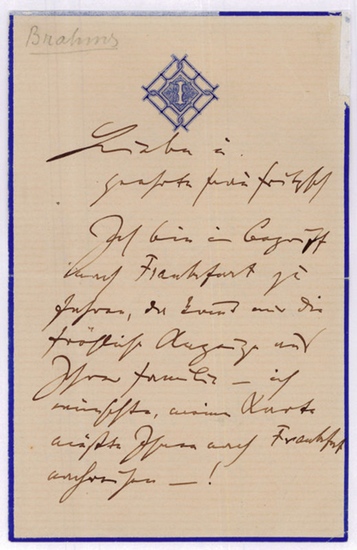 Eigenh. Brief mit U. ("JBrahms"). O. O., [1882]. 2? SS. auf Doppelblatt. 8vo. An die Gattin des Musikverlegers Ernst Wilhelm Fritzsch: "Ich bin im Begriff nach Frankfurt zu fahren, da kommt mir die fröhliche Anzeige aus Ihrer Familie - ich wünschte, meine Karte möchte Ihnen nach Frankfurt nachreisen -! Leider aber meine ich wenig Hoffnung haben zu dürfen Sie dort zu sehen. Jetzt aber ist der Koffer gepackt u. ich kann m. Glückwunsch nur noch beste Grüße beifügen. Bülow[,] der jetzt hier ist, spricht gar oft von Ihnen u. würde gewiß gern seinen Gruß beifügen! [...]". - Auf Briefpapier mit gepr. Vignette; mit kleinen Randläsuren.