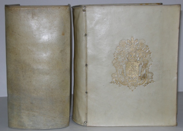 Codex diplomaticus Equestris cum Continuatione, oder Reichs-Ritter-Archiv Mit dessen Fortsetzung. Dessen Ersterer Band in sich hält: I. Die Verainen, Bündnussen, Gesellschafft-Brieff, Thurniers-Ordnungen, mit zerschiedenen Kayserl. Rescriptis & Mandats, de 1392, biß 1531; II. Die Kayserliche Confirmationes, Declarationes, Extensiones, Privilegia Rescripta, Madata, Decreta, Promotoriales, Requisiorales...; III. Allerhand Documenta, Conclusa, Decreta, Rescripta, mandata, Sentenzen, paritorien, als: puncto Paetorum Dotalium, Verzüchten, Ledigen Anfällen...; IV. Diplomata, Instrumenta, Conclusa & Decreta Caesareapoaeo alienationis & Acquisitionis Vonorum Equestrium, Advocatiae Ecclesiasticae, Matrimonii imparis com plebeja ...; In dessen zweytem Band sich befinden: I. Die zu denen Recpprocirlichen Deductionen Thesauri Equestris gehörige Documenta, und Beylagen, ut Puncto Collectationis, Immedietatis, Retractus...; II. Documenta varia, ut Recessus, Uniones, Gravamina Equestria publica, & Judicialia, Caesarea Rescriptta, Dehortatoria, Inhibitoria, Avocatoria, ....; III. Diplomata, Rescripta, Conclusa & alia Documenta, puncto Novissimae Confirmationis & intimationis Privilegiorum Equestrium, com Extensione puncto Juris Retraetus...; IV. Diplomata, Documenta, Conclusa Caesarea, Sententiae ut puncto Concursus Creditorum, Unionis, Fori Caesarei, Austregalis, Alimentationis, Successionis Allodialis, Fidei-commissariae, Feudalis, ... Ulm, Daniel Süßen, 1721. , 2 Bände 3 Bl., 1464 S., 36 Bl., gest. Frontisp.; 3 Bl., 1672 S., 43 Bl. Ganzpergamentbände der Zeit mit Wappensupralibros, 4°. schöne Exemplare, Erste Ausgabe. - Vgl. Putter, Staatsrecht, I 320 und Kat. des Kammergerichts Berlin 1249. ADB III 601. Burgermeister (1663-1722) war Syndikus der schwäbischen freien Reichsritterschaft und später kaiserl. Rat in Ulm. "Er war der eifrigste Vertheidiger der Privilegien der freien Reichsritterschaft. Diesen Gegenstand betreffen fast alle seine, deutsch abgefassten Schriften. Obgleich ohne Plan und Kritik ... enthalten dieselben doch schatzbares Material fur die Geschichte der Reichsritterschaft",.