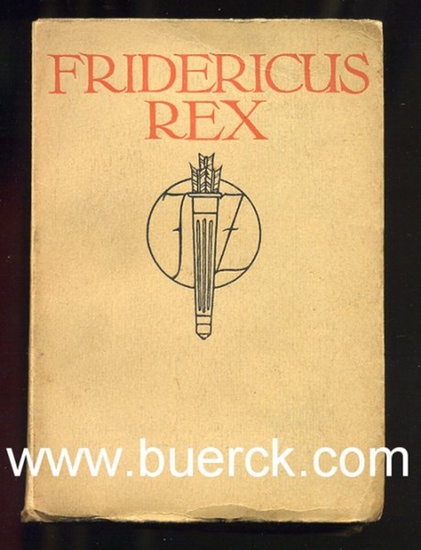 Fridericus Rex. Aussprüche und Gedanken Friedrichs von Preußen. Gesammelt und herausgegeben von Robert Rehlen [d.i. Julius Zeitler]. Mit einem Portät Friedrichs nach Anton Graff. Ausstattung von Walter Tiemann. Leipzig: Verlag Julius Zeitler. 1907. Klein-Oktav, 16,2 x 11,3 cm. (etwas schiefgelesen, Rücken, sowie erstes und letztes Blatt etwas braunfleckig, sonst innen sauber, Druck auf gutem Papier, unbeschnitten und recht breitrandig, insgesamt gut erhalten). Erste Ausgabe in dieser Form. Versammelt fast 1100 Zitate.