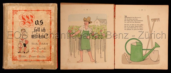 Was soll ich werden? Ein lehrreiches Bilderbuch. München, Braun und Schneider, (1888). Kl.-4°. 59 S. Mit farb. Illustrationen von Lothar Meggendorfer. Illustr. Orig.-Pappband. + Wichtig: Für unsere Kunden in der EU erfolgt der Versand alle 14 Tage verzollt ab Deutschland / Postbank-Konto in Deutschland vorhanden +, Einband u. Illustr. Krahé 133. - Bilderbuch mit zahlreichen abgebildeten und beschriebenen Berufen. Ungewöhnlich gebunden, Seiten von hinten nach vorne. - Mit stärkeren Gebrauchsspuren.