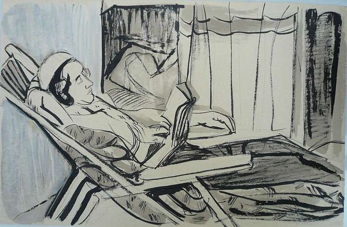 Lesende im Liegestuhl. Tuschpinsel, mit Aquarell laviert. 30er Jahre. Verso mit Nachlassstempel des Künstlers "Nachlass Erich Hartmann beglaubigt vom Testamentsvollstrecker". Auf Velin. 38,2 x 59 cm. Der bildparallel angelegte Liegestuhl mit der Lesenden nimmt die gesamte Breite des Blattes ein. Rechts im Hintergrund ist ein Fenster durch einer mit wenigen Strichen skizzierte Gardine angedeutet. Der hell lavierte Hintergrund links hebt den Kopf der Lesenden hervor. Vermutlich handelt es sich bei der Lesenden Frau um Hartmanns Ehefrau Ida Jenichen. Erich Hartmann leistet einen entscheidenden Beitrag zur Ausbildung und Entwicklung des expressiv realistischen Hamburger Sezessionsstils um 1930. Nach seinem Studium an der Düsseldorfer und Münchener Akademie kommt er 1918 in seine Wahlheimat Hamburg. Ein Jahr später tritt er der Hamburgischen Sezession bei. 1922-44 unterrichtet Hartmann an der privaten Kunstschule Gerda Koppel, an der bedeutende Avantgarde-Maler wie Friedrich Ahlers-Hestermann und Eduard Bargheer zu seinen Kollegen zählen. Durch die Vermittlung von Fritz Schumacher erhält Hartmann mehrere öffentliche Aufträge. 1937 - im Entstehungsjahr des Aqarells - an der Hamburger Kunsthalle und in Stettin Arbeiten von Hartmann durch die Nationalsozialisten entfernt. Nach dem Krieg ist Hartmann von 1946-53 Leiter der Malklasse an der Landeskunstschule Hamburg. Ende der 1940er Jahre löst sich Hartmann von seinen Vorbildern und beschreitet einen eigenen Weg, bei dem er die Form der Farbe unterordnet. Seine späten Arbeiten bewegen sich zwischen Abstraktion und Gegenständlichkeit. - Minimal gebräunt, wenige unbedeutende Fleckchen. Am Unterrand wohl etwas beschnitten, aber ohne Darstellungsverlust. Partiell kleine Papierausdünnungen. Rechte untere Ecke mit kleiner Knickspur und am rechten Rand zwei kleine Einrisse.