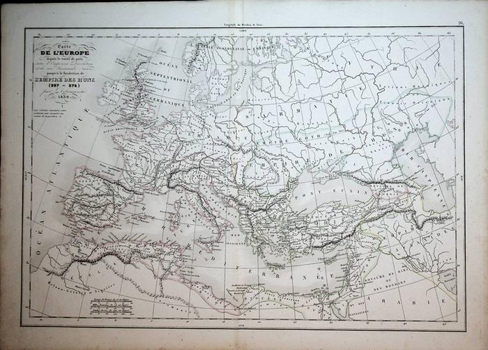 EUROPE, LATE ANTIQUITY, MAP / EUROPA IN DER SP?TANTIKE, LANDKARTE/ DELAMARCHE 1839 ; Titel Carte de Europa depuis Le traite de Paix entre L 'empereur Diocletien et Le Roi sassanide Narsea jusqu 'a La fondation de l 'empire des huns (297?376). ; Par Delamarche 1839. [Paris], Delamarche, 1839. original map, old colours, original Landkarte, altkoloriert , Blatt ca. 34 x 47 cm. ORIGINAL MAP /ORIGINALE LANDKARTE.