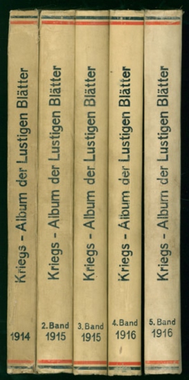 Kriegs-Album der Lustigen Blätter. 1914-1916. Band 1-5. [5 Bände.] Berlin, Verlag der lustigen Blätter (Dr. Eysler & Co), 1914-1916. 4°. 32 cm. Nicht durchgehend paginiert. Jedes Heft mit 16 Seiten. Illustrierte Original-Halbleinenbände. 1. Auflage. Mit zahlreichen Abbildungen in Farbe und Schwarz-Weiß von Walter Trier, P. Simmel, F. Jüttner, W. A. Wellner, Heinrich Zille, E. Heilemann, Lutz Ehrenberger, R. W. Busch Ernst Stern u.a. Einbände an den Kanten leicht berieben, Außenfalze mit kleinen Einrissen, leicht gebräunt, Hinterdeckel leicht fleckig. Ein Vorsatz im Innenfalz mit Einriss. Titelblätter mit Namenseintrag. Gute bis sehr gute Exemplare.