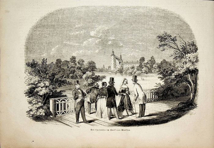 BAD MUSKAU, Schloss Muskau, Luciesee Ansicht ca. 1850 ca. 1850. original Xylographie, Darstellung ca. 15,5 x 22,5 cm. Antique Print, antike Grafik.