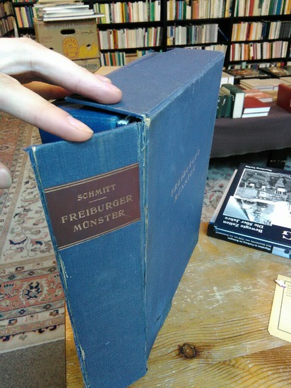 Gotische Skulpturen des Freiburger Münsters. 2 Bände komplett. Frankfurt, Frankfurter Verlagsanstalt 1926. 62; XXV Seiten, sowie 300 Tafeln. Broschuren und lose Tafeln in Leinenkassette. Vollständig! Leinenkassette stark berieben, bestoßen und fleckig, sowie vollständig in zwei Teile getrennt und an einer Kante circa 2cm eingerissen. Oberer Deckel der Kassette mit Wasserschaden. Einbände der Broschuren leicht bestoßen und fleckig. Tafeln gut erhalten.