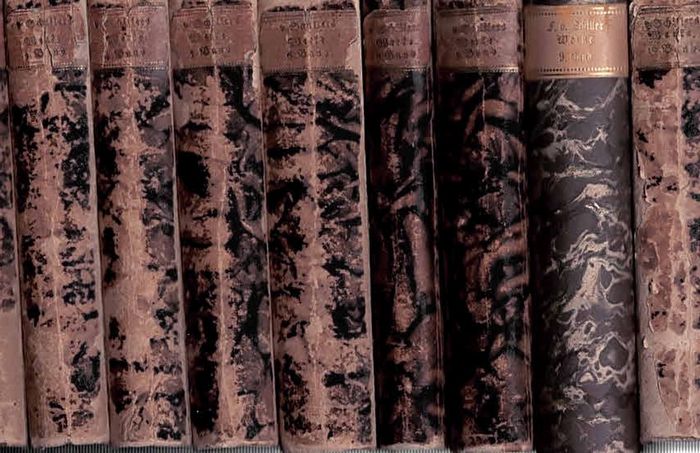 Friedrich von Schillers sämmtliche Werke. [Bdd. 1-8:] Mit Königl. Sächsischen und Königl. Westphälischen allergnädigsten Privilegien gegen den Nachdruck und den Verkauf der Nachdrücke [Bdd. 9-12:] Mit allergnädigsten Privilegien gegen den Nachdruck und den Verkauf der Nachdrücke. 12 Bdd. Stuttgart und Tübingen, Cotta, 1812-15. 8°. Pp. d. Zt. Rundumrotschnitt. Alters- und Gebrauchsspuren. Ecken und Kanten beschabt und bestoßen. Bezugspapier berieben. Bd. 9 neu eingebunden. LRs teilweise beschädigt, zum Teil mit Materialverlust. Gelegentlich Wurmspuren. Durchgängig leicht braunfleckig. WG²49 - Hirschberger, Taschengoedeke, S. 445. - Nach dem ersten, unrechtmäßigen Druck 1810-11 in Wien die erste rechtmäßige Gesamtausgabe der Werke Schillers. - Bd. 1 mit Abdruck der Privilegien sowie einem Subskribenten-Verzeichnis. Der erste Nachtrag zum Subskribenten-Verzeichnis ist nicht mit eingebunden. Bd. 8: Zweiter Nachtrag, Bd. 9: Dritter Nachtrag.