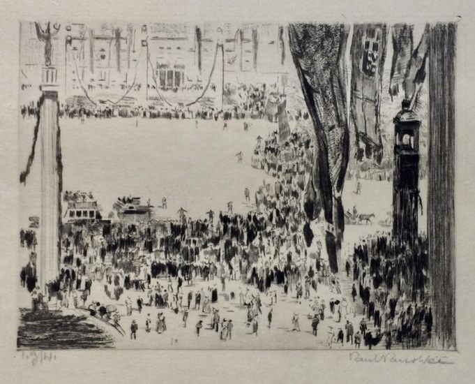 Festtage in Berlin I. Radierung. Original Kaltnadelradierung auf Japan, 17,5 x 23,5 cm (Plattenrand), 28 x 31 cm (Blattgröße); links unten bezeichnet "1. Zustand", rechts unten in Bleistift signiert. Links oben im Rand knitterspurig, sonst gut und sauber erhalten. Mit seinen Kaltnadelradierungen kann sich Paeschke (Berlin 1875 - 1943) mit Künstlern wie Liebermann, Slevogt und auch Lesser Ury durchaus messen lassen.
