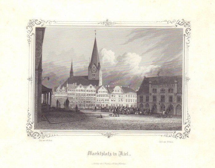 Marktplatz in Kiel. - München:, Poppel u. Kurz, 1848. Stahlstich 8 x 11,5 cm, Blattgröße 15 x 23 cm. Georg Michael Kurz, Zeichner und Stecher. - Mittig die Nikolaikirche, auf dem Platz lebhafte Personenstaffage. Die Ansicht umgeben mit schmückender Bordüre. - Aus: Hermann Biernatzki, Schleswig-Holstein. - Georg Michael Kurz 1815 - 1883, Zeichner, Kupfer- und Stahlstecher, Verleger. - Die Darstellung mit feinen hell-dunkel Kontrasten.