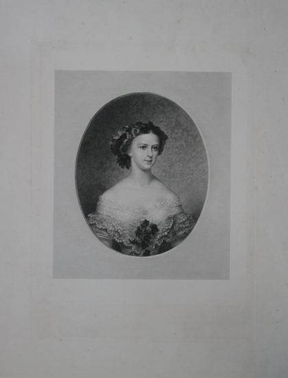 Porträt. Brustfigur mit schulterfreiem Spitzenkleid in Oval, Haare hinten mit Efeu. Kupferstich von Franz Xaver Stöber nach Schrotzberg. Probeabzug vor aller Schrift. (Wien, Paterno), ca. 1855. Format Platte: 495 x 370 mm. Bildbereich: 345 x 290 mm. Blattgröße: 655 x 520 mm. *Elisabeth Amalie Eugenie, Herzogin in Bayern (auch Sisi, Sissi oder Lisi genannt (1837-1898) war eine Prinzessin des Hauses Wittelsbach und durch ihre Heirat mit Franz Joseph I. ab 1854 Kaiserin von Österreich. - Bekanntes Bildnis von dem Österreichischen Künstler F.X. Stöber (1795-1858), hier ein Exemplar der ersten Probeabzüge vor aller Schrift (wurde danach vom Verlag Paterno mit Beschriftung verlegt). Im Biographischen Lexikon des Kaiserthums Oesterreich wird dieses Blatt ausdrücklich als eines der wenigen trefflich gearbeiteten Bildnisse bezeichnet: "Die Zahl der Porträte ist sehr groß, aber nur die kleinste Zahl derselben gibt die Anmuth der Gesichtszüge der erlauchten Fürstin treu wieder. Es wird sich hier nur auf die Anführung der trefflichsten und als solcher anerkannten Porträte beschränkt ? 8) nach Schrotzberg in Linienmanier gest. von F. Stöber". - Vollrandiges und sehr gut erhaltenes Exemplar aus der Provenienz Wittelsbach.