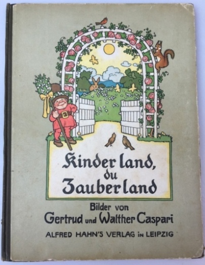 Kinderland du Zauberland. Schöne Kinderlieder aus neuer und neuester Zeit, 1. Auflage, Leipzig, Alfred Hahn Verlag, (1908). Mit zahlreichen farbigen (zum Teil ganzseitigen) Illustrationen, farbiger Titelbordüre, 43 (1) Seiten, 4°, grünes illustriertes Ohln. EA, Gutes Exemplar mit gestempeltem Besitzvermerk. Erste zwei Blätter lose, Kanten und Ecken etwas berieben und bestossen. Buchblock etwas gelockert. Vordere Bindung angeplatzt.
