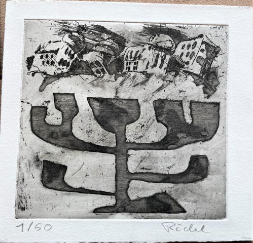 Synagoga. Ausstellungskatalog Bambergerhaus Rendsburg 1988. Mit mehr., teils farbigen Abbildungen. Berlin, Westkreuz-Dr., 1988. 16 nn. Seiten. Original Broschur. Eins von 50 (GA 400) Exemplaren der Vorzugsausgabe mit einer signierten Original-Radierung. Mit eigenhändiger Widmung auf Titelblatt an Prof. Grützmacher. OA243.