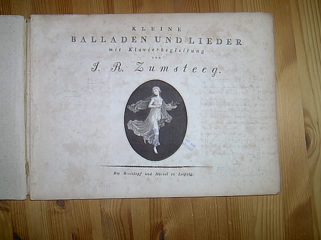 Kleine Balladen und Lieder mit Klavierbegleitung. Fünftes Heft. Leipzig, Breitkopf und Härtel (1803). Titelblatt mit gestochener Vignette, 52 S., Qu.-Folio., mit Originalumschlag,. ehemaliges Bibliotheksexemplar mit Deckel-Signaturschild und Stempeln ("ausgeschieden"), Umschlagdeckel lose, Bindung gelöst (Seiten lose), Seiten etwas gebräunt und stark braun-/stockfleckig, Titelblatt und fast alle Seiten mit Bleistiftanmerkungen (von Ludwig Schiedermair), (u.a. mit Texten von Hölty, Bürger und Herder),.
