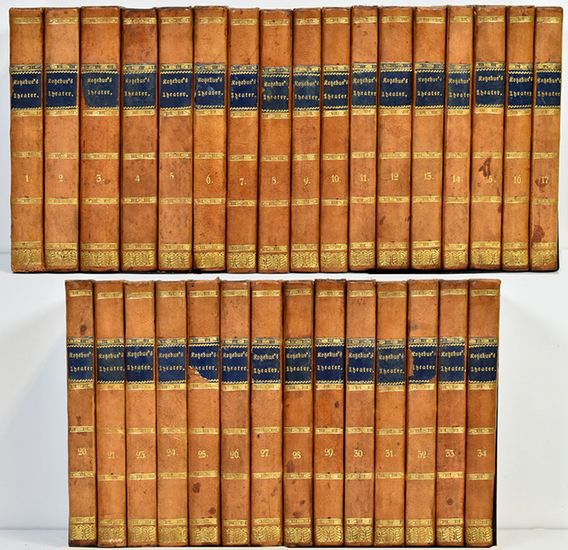 Erheiterungs-Bibliothek für Freunde romantischer Lectüre. Neue Folge. Theater. Erster bis vierunddreissigster Band. (31 von 34 Bänden). Wien, bey Christian Kaulfuß, 1825. Klein-8°. 16,5 x 10,5 cm. ca. 8000 Seiten. Hellbraune Halblederbände der Zeit, mit goldgeprägten Rückentiteln auf schwarzen Lederschildchen. 1. Auflage. Jeder Band mit einem gestochenen Frontispiz (Kupfertafel zu einem Theaterstück) und gestochenem Titelblatt. Die Bände 18, 19, und 22 fehlen! Einbände teils minimal fleckig, wenig bestoßen, 2 Rückenschildchen mit winzigen Fehlstellen, ansonsten (vor allem innen und Stiche) sehr gute Exemplare.