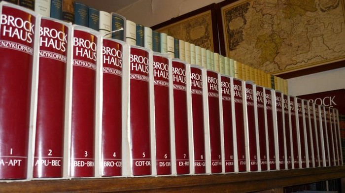 Brockhaus Enzyklopädie in vierundzwanzig Bänden. Neunzehnte (19.), völlig neu bearbeitete Auflage. Mit 1 Ergänzungsband. 25 Bände. Mannheim, F. A. Brockhaus, 1986-1996. Gr.-8vo. Mit tausenden oft farb. Abb. Schwarzes OHldr. m. rotem RSchild. m. Orig.-Schutzumschlag im OPp.-Schuber. Kopfgoldschnitt. Recht aktuelle Ausgabe des Brockhaus, durch den Ergänzugsband auf dem Stand von 1996. Letzte Ausgabe in alter Rechtschreibung. Vollständige Halblederausgabe des 19. Brockhaus mit 24 Bänden A-Z, mit Bd. 30: Ergänzungen A-Z. Die Wörterbücher und der Atlas (Bd. 25-29) liegen nicht vor. - Die Schuber fleckig u. teils lädiert. Vollkommen frische Bände von bester Erhaltung.