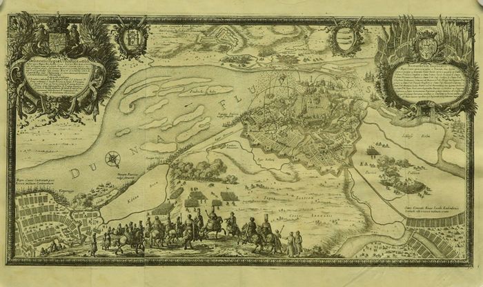 Delineatiop Regiae Urbis Rigae ... ad 5. Octob. Anno 1656 ... . - Nürnberg:, Riegel, 1697. Kupferstich 29,5 x 54,5 cm, Blattgröße 34,5 x 58 cm. Mittig die Stadt Riga aus der Vogelschau, darüber der Fluss Duna. In der befestigten Vorstadt von Riga größere Einheiten, die die Innenstadt mit Kanonen und Mörsern intensiv beschießen. Am unteren Blattrand der Feldherrenhügel, weitere Truppenformierungen und Lager. Bezeichnungen ins Bild gedruckt. Oben links eine prachtvolle Titelkartusche, daneben das Wappen von Riga, in der rechten oberen Bildecke ein Wappen mit drei gekrönten Fischen und eine weitere Kartusche mit zusätzlichen Erklärungen. Gedruckt von zwei Platten. Das Bild umgeben mit einem schmückenden Rahmen.- Aus: De Rebus a Carolo Gustavo Sveciae Regestis .... von Samuel Pufendorf. In dem Werk werden die Feldzüge des schwedischen Königs Karl X Gustav in Polen, Deutschland und Dänemark im ersten Nordischen Krieg 1655 - 1660 beschrieben. Viele der zahlreichen Stiche wurden von Erik Jonsson Graf von Dahlberg gezeichnet. - Samuel Pufendorf 1632 - 1694, Historiker, Natur- und Völkerrechtslehrer; Erik Jonsson von Dahlberg 1625-1703, Feldmarschall, Architekt, Festungsbaumeister; Familie Perelle, im 17. Jahrhundert Zeichner und Kupferstecher in Paris. Vater Gabriel 1603 - 1677, die Söhne Nicolas 1625 - 1695 und Adam 1640 - 1695, Thieme-Becker 26, 401. - Das Papier leicht gebräunt, mehrfach gefaltet, der Druck klar. Ein detailreiches, schönes Blatt.