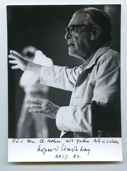 Portraitphotographie mit eigenh. Widmung und U. O. O., 30. Januar 1982. 145:104 mm. Brustbild in S/W im Profil.