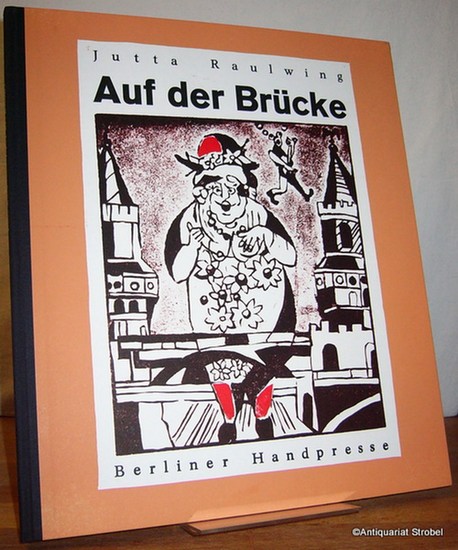 Der Tod & der Philologe. (Berlin), Berliner Handpresse, (2002). 29 S. Mit 5 ganzseitigen farbigen Original-Linolschnitten von Wolfgang Jörg. Gr.-4° (32,5 x 28 cm). Original-Halbleinwand mit weiterem Linolschnitt auf dem Vorderdeckel. Berliner Handpresse, 111. Druck. - Nummer 106 von 300 Exemplaren, im Druckvermerk von Opitz und Jörg signiert. - Tadellos erhalten, allerdings in die falsche Einbanddecke gebunden, nämlich von: Jutta Raulwing, Auf der Brücke (der 112. Druck der Handpresse). Als offensichtlich "durchgerutschter" Fehldruck dadurch wohl Unikat. - Personalisierter Widmungseindruck der Handpresse auf dem weißen Vorsatz (drei Zeilen).