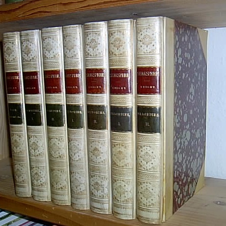 The Standard Edition of the Pictorial Shakspere [Shakspeare / Shakespeare]. Edited by Charles Knight. 7 volume set (Life and Poems, Comedies I + II, Tragedies I + II, Histories I + II). London, Charles Knight & Co. 1846. 4°. (ca. 17 x 25,5 cm), bibliophile Halbpergament-Einbände der Zeit mit reicher Rückenvergoldung, Pergamentecken und marmorierten Deckeln, Kopfgoldschnitt, marmorierte Vorsatzpapiere (aus der Buchbinder-Werkstatt George Winstanley, 1824-1897 in Manchester) / bound in contemporary half vellum with marbled covers and preliminary pages, top edges gilt, according to the little stamp on the preliminary page this set was bound by the bookbinder George Winstanley at Manchester (1824-1897, son of the bookbinder John Winstanley),. Deckel teils minimal berieben, Pergament teils etwas nachgedunkelt, der Kopfgoldschnitt eines Bandes mit kleiner Kratzspur, Papier altersbedingt teils leicht gebräunt, Vorsatzblätter leicht stockfleckig, ansonsten gut erhaltenes und sauberes Exemplar in sehr dekorativem zeitgenössischen Buchbinder-Handeinband, Text in Englisch (gerne senden wir weitere Photos auf Anfrage) / the marbled covering partly minimal rubbed, vellum partly a bit darkened, the gilt top edge of one volume a little bit scratched, paper slightly browned, preliminary pages slightly foxed, else good and clean, text in English, (for more images please send a request),.